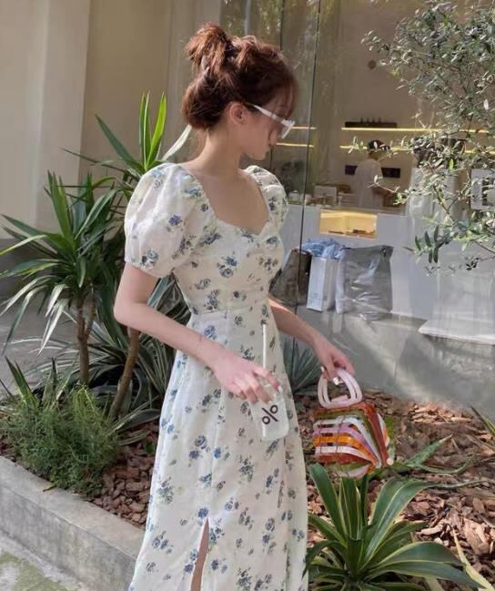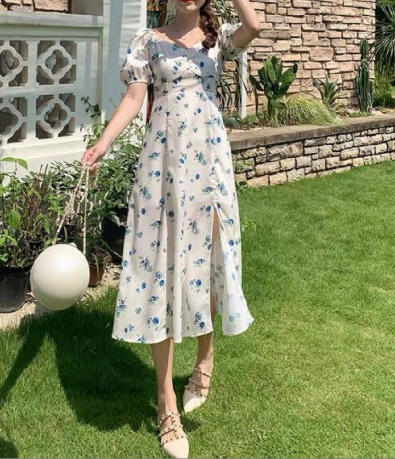 2023春夏新作 女 レディース ハイウエスト 半袖 花柄 ロング ワンピース 台型スカート S-XL