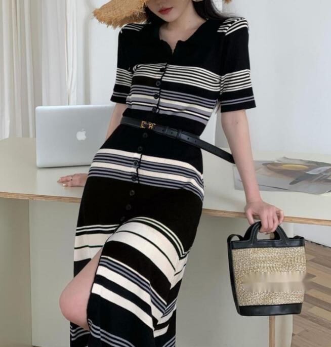 2023春夏新作 女 レディース ハイウエスト 半袖 ニット ボーダー柄 ロング ワンピース 台型スカート