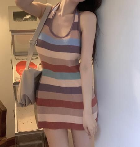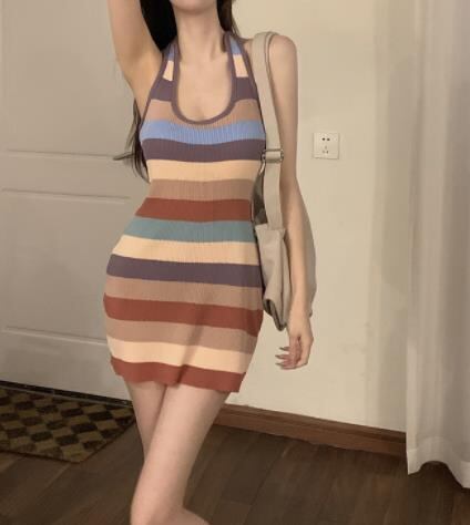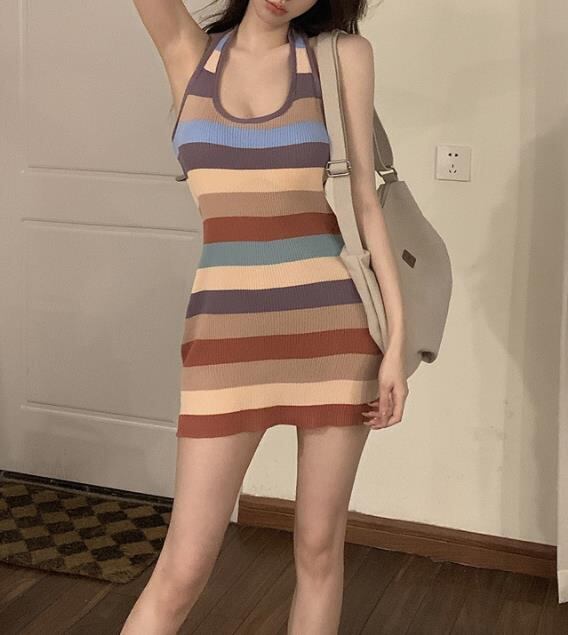 春夏新作 女 レディース 袖なし ボーダー柄 吊りスカート ミニ ワンピース ドレス タイトスカート
