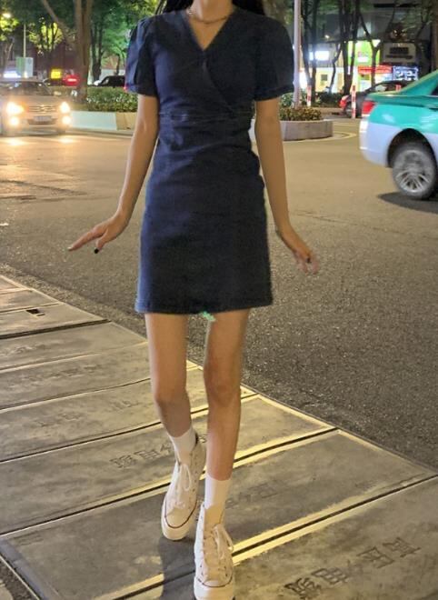 春夏新作 女 レディース ハイウエスト 半袖 デニム ミニ ワンピース ドレス タイトスカート S-L
