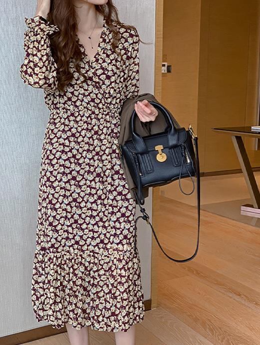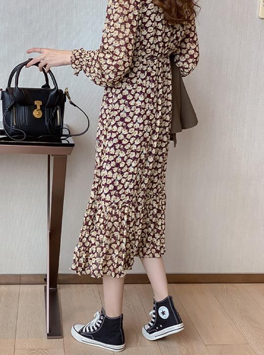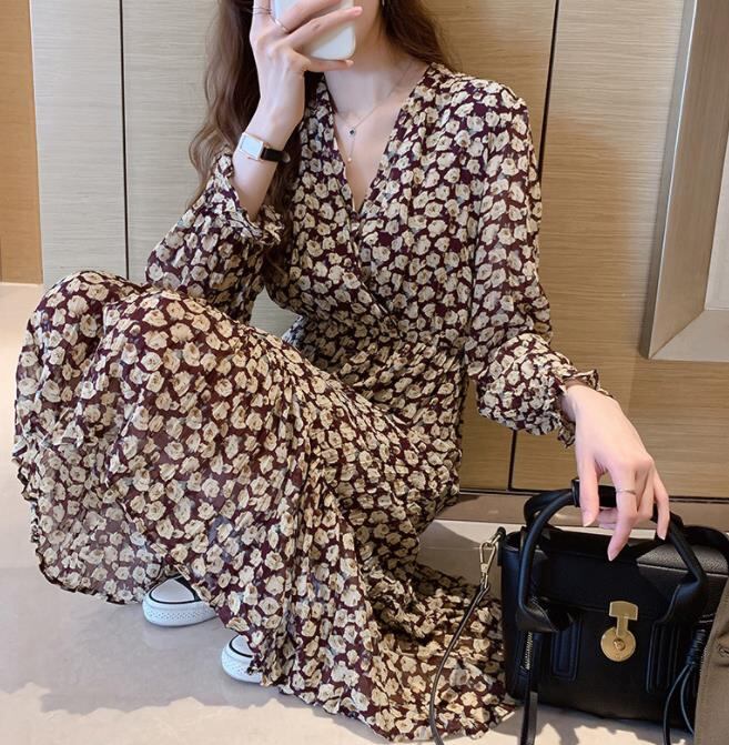 春秋新作 女 レディース ハイウエスト 長袖 シフォン 花柄 ロング ワンピース 台型スカート S-2XL
