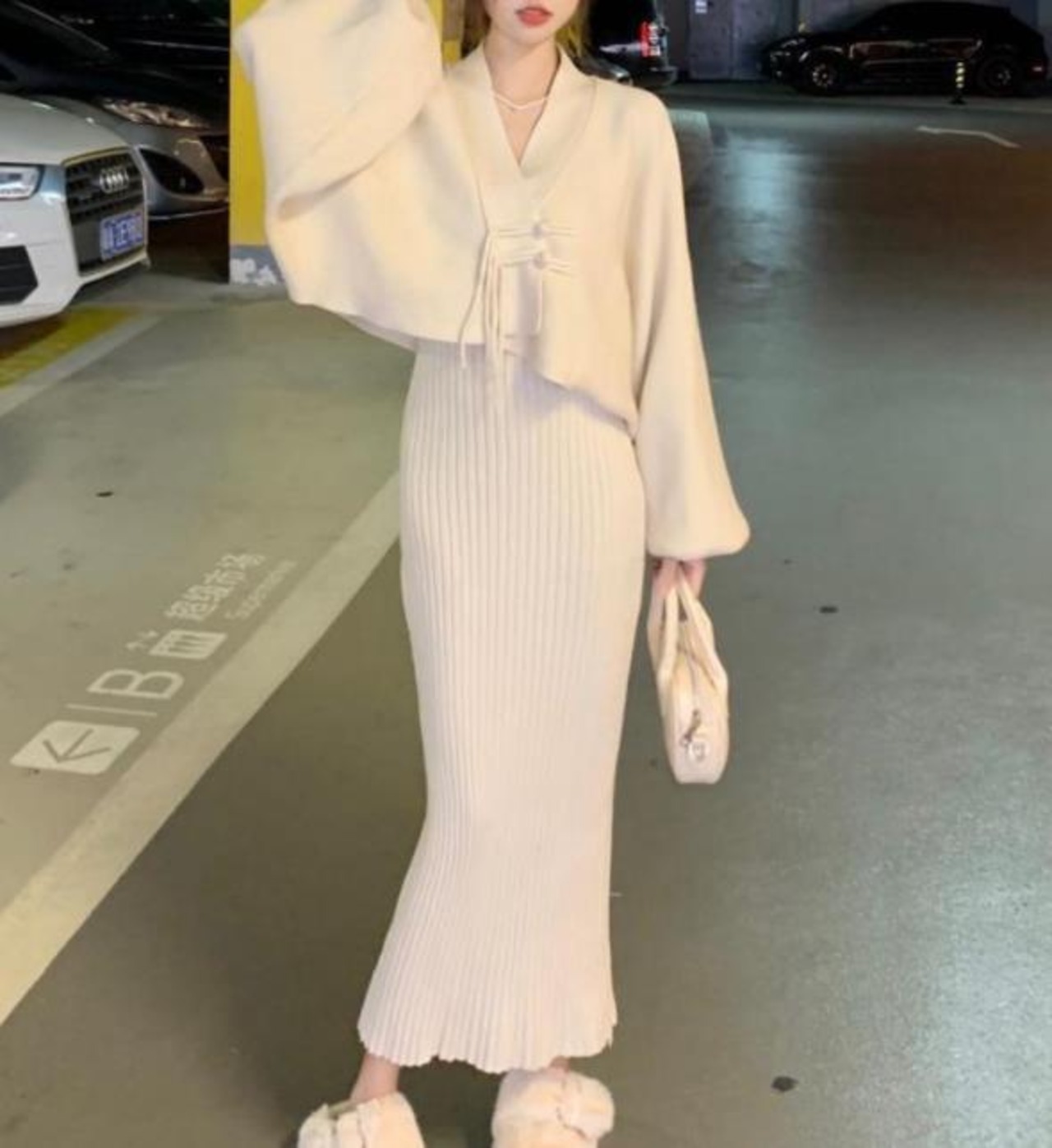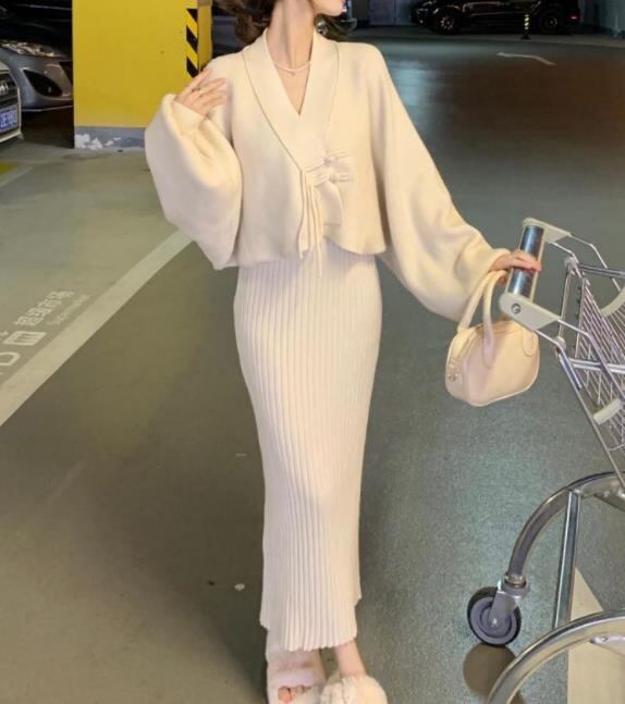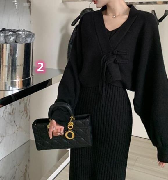 春秋新作 女 レディース ロング ワンピース ニット 袖なし 吊りスカート + コート 2点セット