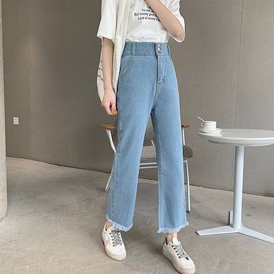 デニムパンツ ハイウエストワイドレッグ大きいサイズジーンズレディース生エッジレッグストレートカジュアルゆったり9分丈パンツ女性
