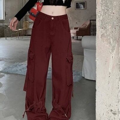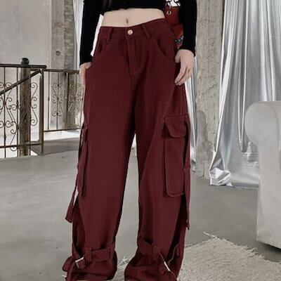 2024秋冬パンツ デニム ジーンズ ロング丈 ワイド ハイウエスト 美脚効果 脚長効果 細見え 秋 エンジ レッド 赤 おしゃれ かわいい 韓国ファッション レディース お出かけ | DOKO-ME
