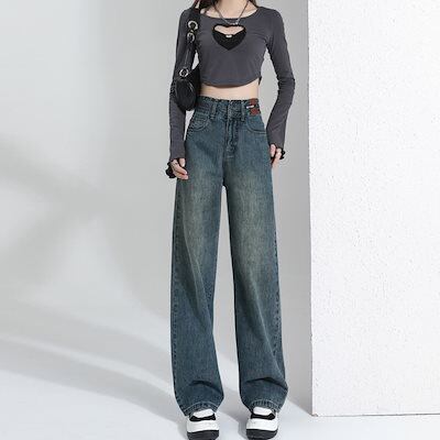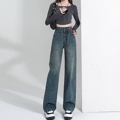 デニムパンツ レトロ ハイウエスト ファッション ワイドパンツ ジーンズ レディース 2024年新作 ゆったり ストレート 韓国