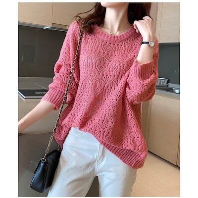 2025春のだるい風ニットゆったり丸首薄手セーター レディース 長袖ブラウストップス