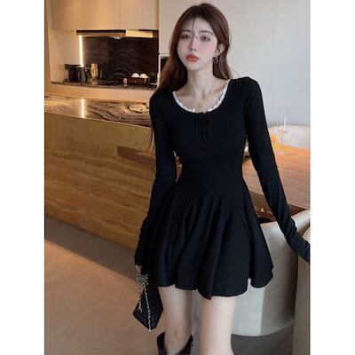 2025春のブラック長袖ワンピース レディーススカート カジュアル ファッション