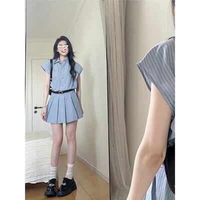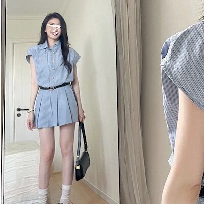 2025春のブルーストライプのシャツワンピース レディース スカートカジュアル ファッション