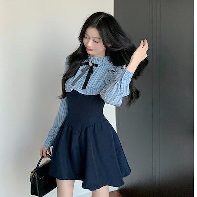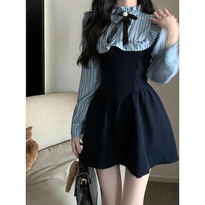 2025春のストライプ長袖シャツワンピース カジュアル スカート OL 通勤