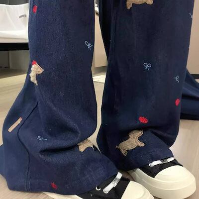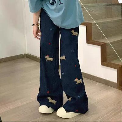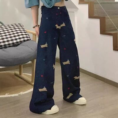 【3日以内出荷】脚長効果!デニムパンツ レトロ クリエイティブ 漫画 ハイウエスト ジーンズ レディース 春と秋 ゆったり ワイドパンツ レジャー 多用途 韓国ファッション