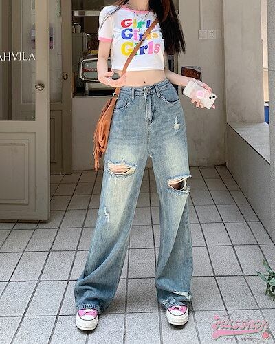 2024春夏 パンツ デニム ジーンズ ワイド ストレート ハイウエスト 脚長効果 美脚効果 細見え 加工 カジュアル 韓国ファッション系 レディース お出かけ