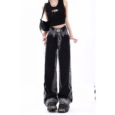 大きいサイズアメリカンレトロデザインセンス衝突ジーンズ女性秋冬ストレートワイドパンツ潮