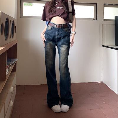デニムかっこいい!スラックスパンツ2025春 マイクロラッパ デニムパンツ おしゃれレディース ワイドレッグモップパンツ アメリカンレトロ ハイウエストでゆったり 見えやせ 垂れ感