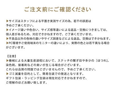 サイズ交換、お色交換などの返品、交換は行っておりませんので十分にお確かめの上、ご購入お願い致します。