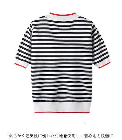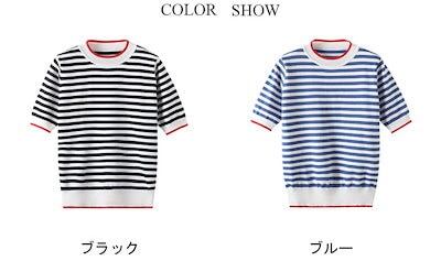 【急速出荷】サマーニット レディース Tシャツ ショート丈 可愛い おしゃれ ゆったり リブトップス ボーダー ラウンドネック 半袖 シンプル キレイめ トップス 夏新作