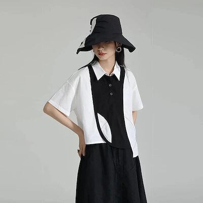 【J.Fashion】 黒白 ドッキング Tシャツ 不規則裾 夏 半袖 レディース ブラウス レディース おしゃれ 上質 関連商品は店で購入可能 メガ割30%までに制限