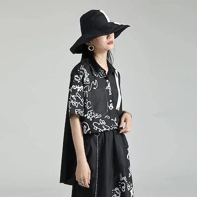 【J.Fashion】 前短後長 柄ブラウス 体型カバー レディースブラック シャツ 半袖 おしゃれ トップス 関連商品は店で購入可能 メガ割30%までに制限