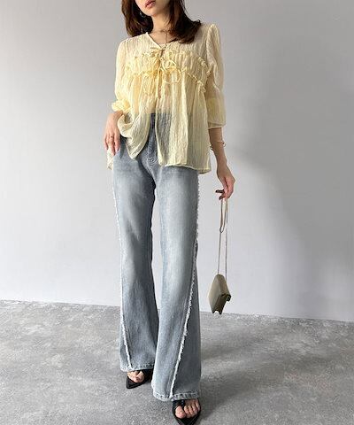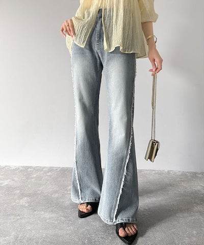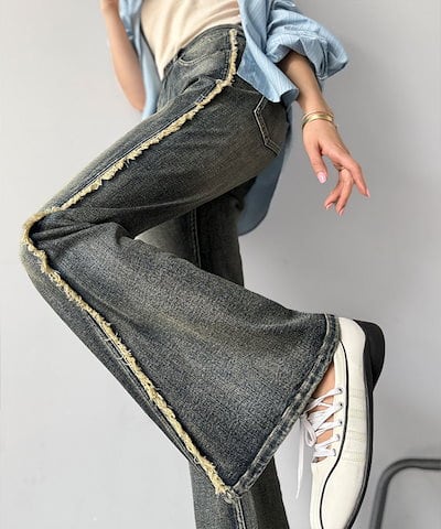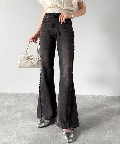 Classical Elfmilybilet ボトムス パンツ レディース サイド フリンジ使い ヴィンテージ風 デニム フレアパンツ ハイウエスト スタイルアップ ロングシーズン 大きいサイズ