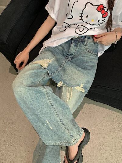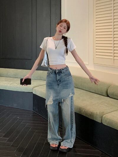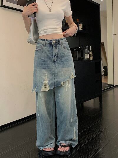 2025 夏 韓国パンツ ロング丈 デニム ジーンズ 2枚重ね ハイウエスト 美脚効果 脚長効果 細見え 夏 おしゃれ かわいい 韓国系ファッション レディース 加工メンズライク