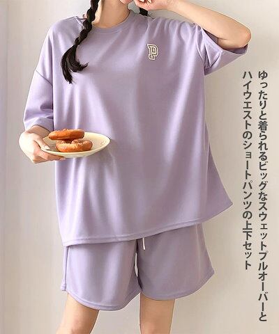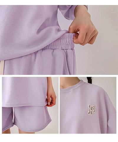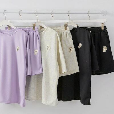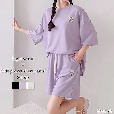 リアル スタイルワッペンライトスウェット×サイドポケットショートパンツセットアップ レディース 夏 半袖 上下セット カジュアル ズボン トップス ボトムス ゆったり 部屋着 ウエストゴム 無地 ライトスエット 楽ち