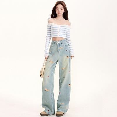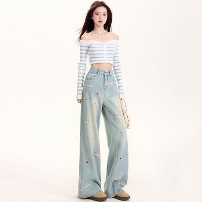 デニムかっこいい!スラックスパンツシンプルカジュアル 2025春 ダックスフント ワイドパンツ デニムパンツ 刺繍 ハイウエストゆったり見えやせ パンツ レディース
