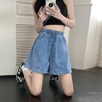 レディースハイウエストショートパンツ体型カバーデニムパンツお洒落ゴム入り短パン大きいサイズ無地デニムカジュアルボトムス脚脚長着痩せ細見えワイドパンツ