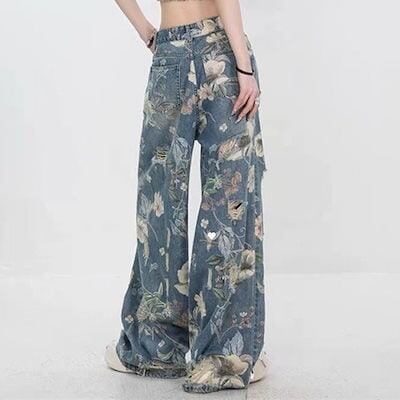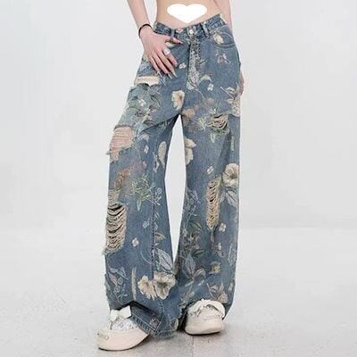 花卉プリントの穴が開いたジーンズ女性夏の新型の薄い腰がゆったりしているズボン