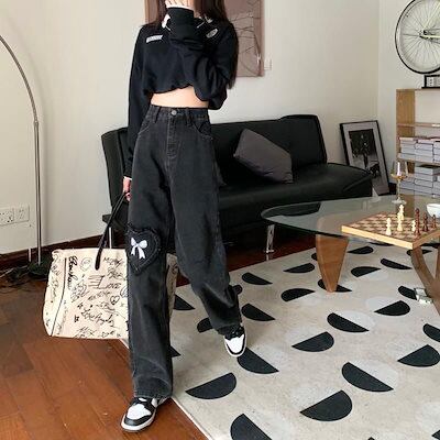 5月の新製品 デニムハートリボンジーンズレディース春ins新作ゆったりハイウエストストレートワイドワイドスラックス学生ファッション
