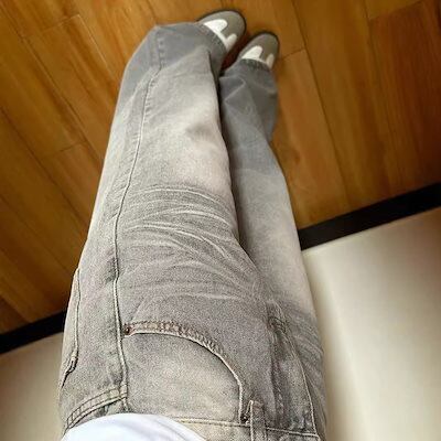 灰色のアメリカのレトロな広脚ジーンズの女性春秋波紋の垂れ下がった感じのゆるいストレートなズボン
