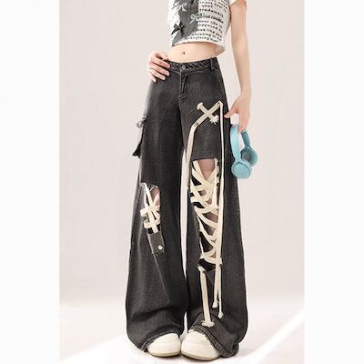 高級デザイン感アメリカのレトロな黒いストラップに穴が開いたジーンズ女性夏の工装広足のゆるいズボン