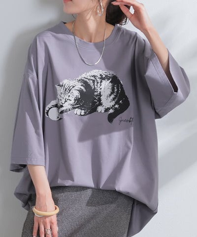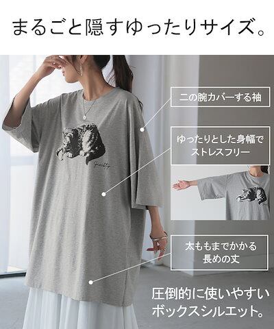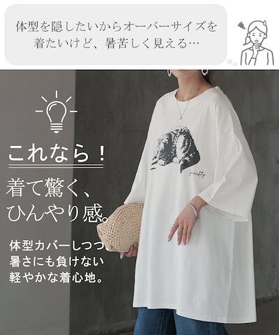 HUG.U猫 Tシャツ 接触冷感 ロゴ トップス レディース 半袖 プリント カットソー ロング ティーシャツ チュニック ビッグ プラスサイズ クルーネック 長い ゆったり 体型カバー お尻が隠
