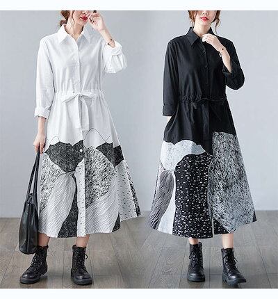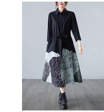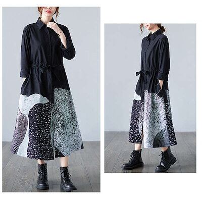 シャツワンピース レディース 長袖 ウエストマークワンピ ロングワンピース 前開き 前ボタン留め 折り襟 プリント ゆったり ウエスト紐付き フレア 秋物 春秋 おしゃれ