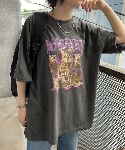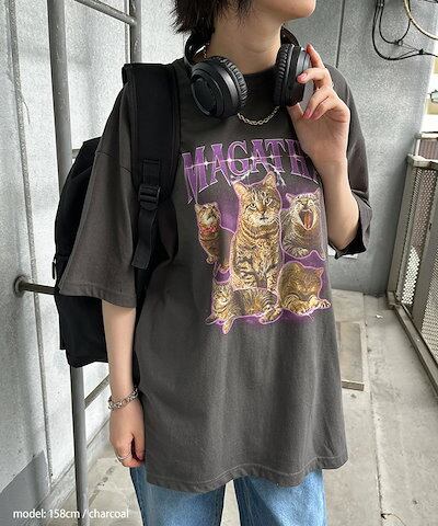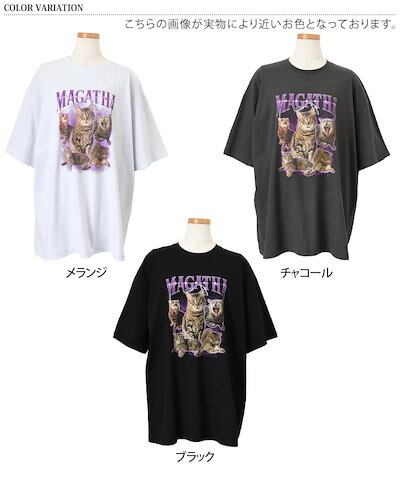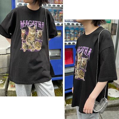 リアル スタイルビッグシルエットキャットグラフィックプリントコットンTシャツ レディース トップス カットソー 夏 半袖 5分袖 綿100% ゆったり 大きいサイズ ロング丈 韓国 おしゃれ カジュアル