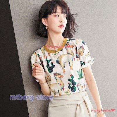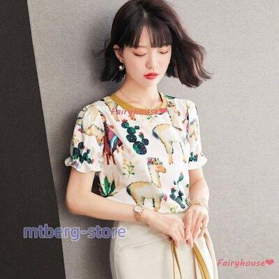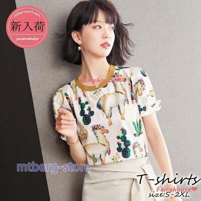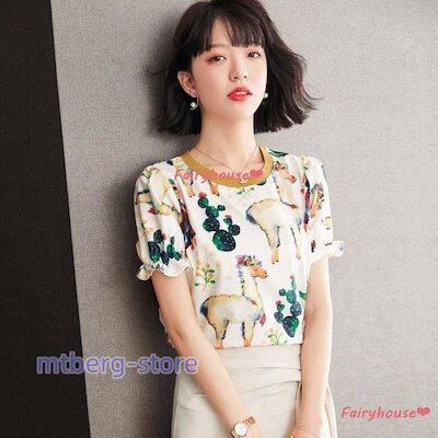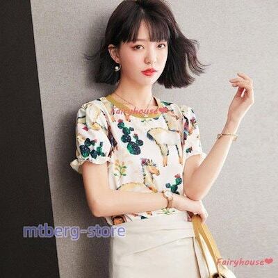 【Kizoo】Tシャツ レディース 40代 きれいめ 夏 上品ブラウス 半袖Tシャツ パフスリーブ プリントトップス カジュアル韓国風 カットソー オシャレ ゆったりtシャツ30代