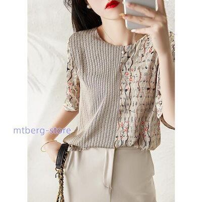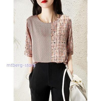 【Kizoo】Tシャツ レディース 40代 春夏新作 オシャレブラウス シフォンTシャツ 五分袖トップス プリント切り替え Tブラウス 大人 通勤 ゆったりTシャツ カットソー