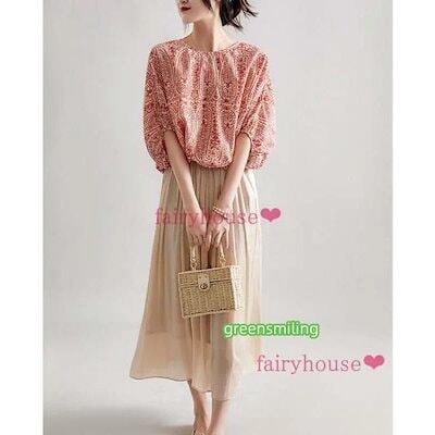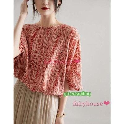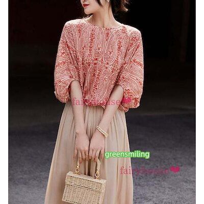 ブラウスレディース40代 夏五分袖ブラウス オシャレブラウス エスニック風プリントTブラウス リボン ドルマンスリーブ パフスリーブトップス ゆったりtシャツブラウスレディース40代 夏五分袖ブラウス