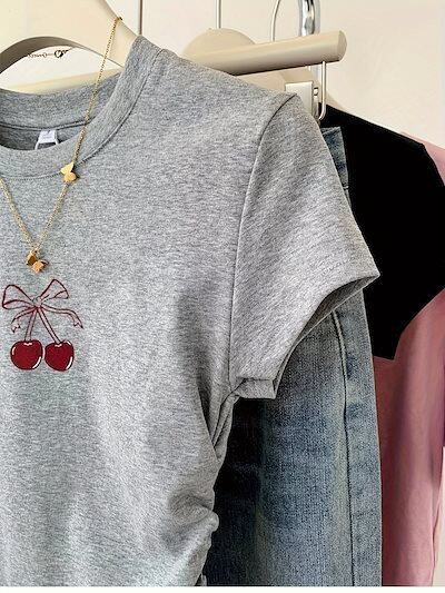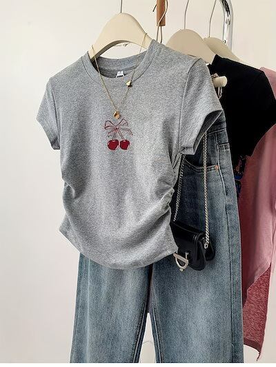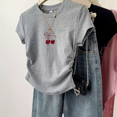 レディース チェリープリント クルーネックTシャツ カジュアル ドローストリング 半袖Tシャツ 春夏用