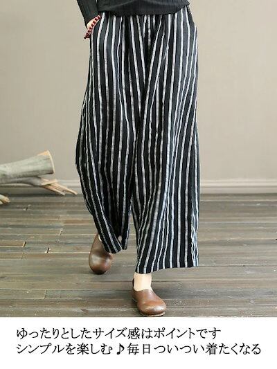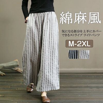 ストライプ 生地 ワイドパンツ 春 九分丈 パンツ レディース 春秋 ガウチョパンツ 綿麻風 ウェストゴム イージーパンツ 秋 ハイウェストパンツ ワイド ハイウェスト ロングパンツ ボリューム カジ