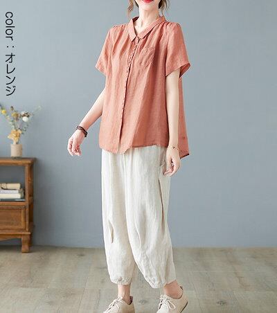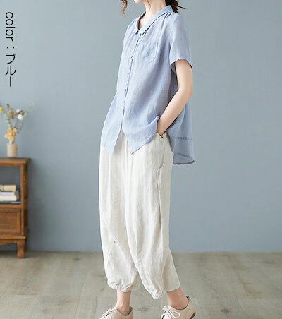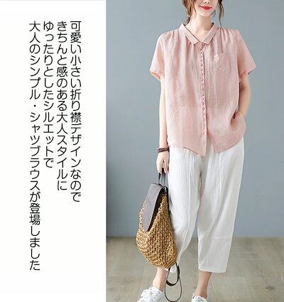 リネン シャツ 半袖 ブラウス 可愛い おしゃれ シャツブラウス ロング レディース 麻混 折り襟 綿麻シャツ 無地 シンプル ナチュラル リネンブラウス ゆったり 襟付きブラウス 全開 ボタン留め