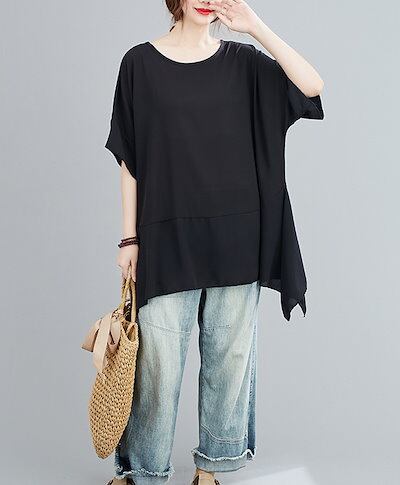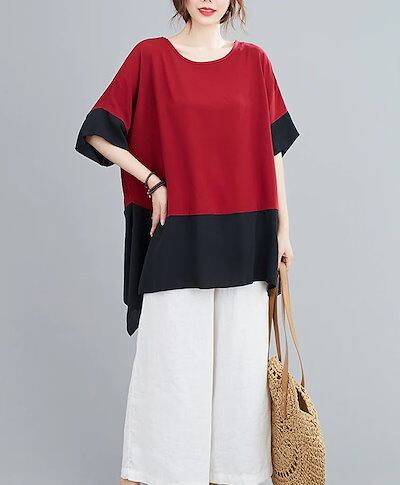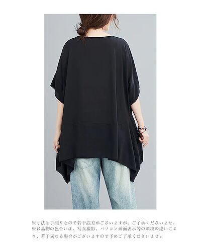 チュニック ブラウス レディース 夏 カットソー 配色 トップス プルオーバー ゆったり ロングtシャツ 大きいサイズ 五分袖 ゆるシャツ 体系カバー クルーネック ドルマン ハンカチヘム チュニッ