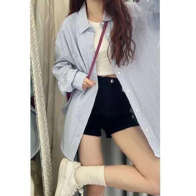 2025 春 夏 シャツ レディース ブラウス ブルーストライプシャツ シャツ インナー トップス 韓国ファッション