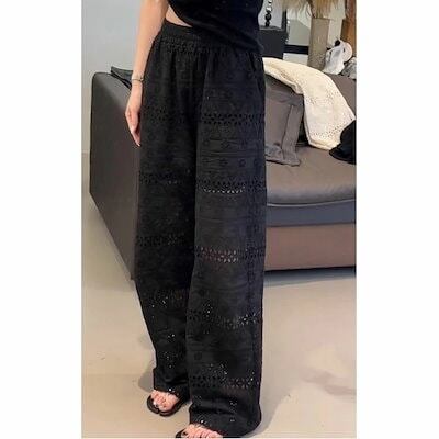ワイドパンツ レディース レース ペチパンツ ロング イージーパンツ 夏 ハイウエスト ウエストゴム 総レース 裾レース パンツ ボトムス インナー ズボン 長ズボン ロングパンツ 重ね着 刺繍 フレ