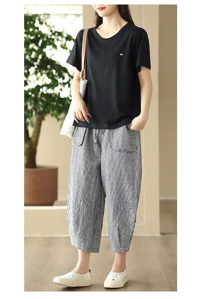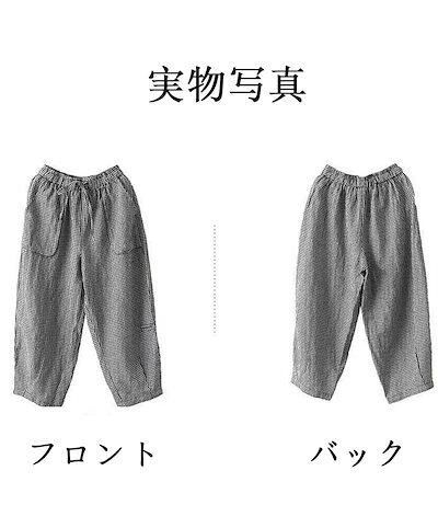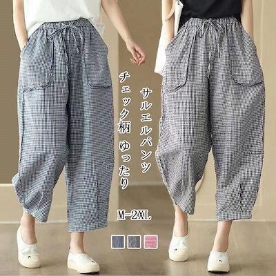 チェックパンツ レディース サルエルパンツ 9分丈 チェック柄 パンツ ウエストゴム ハイウエスト ポケット リボン 綿麻 イージーパンツ チェック 体型カバー ボトムス 大きいサイズ ゆったり きれ