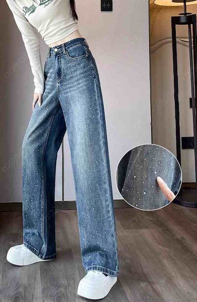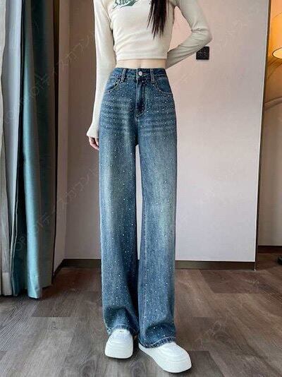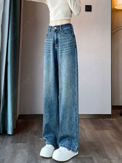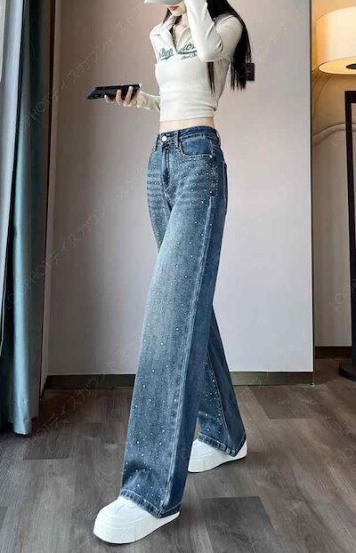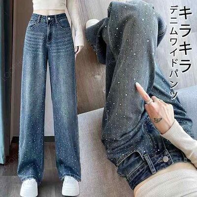 2A44ラインストーン デニム ワイドパンツ レディース キラキラ ジーンズ ストレートデニム ワイドデニム ストレートジーンズ ゆったり ワイド ハイウエスト お洒落 カジュアル 韓国ファッ 大き