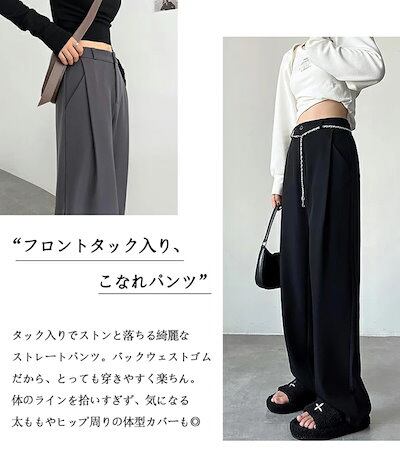 ストレートパンツ レディース ハイウエスト パンツ ワイド バックゴム ロングパンツ 春夏 ストレート ゆったり ワイドパンツ ロング丈 セミワイド ボリューム タック ポケット 美脚 タックパンツ