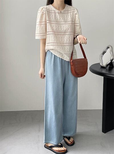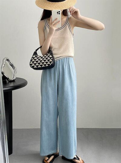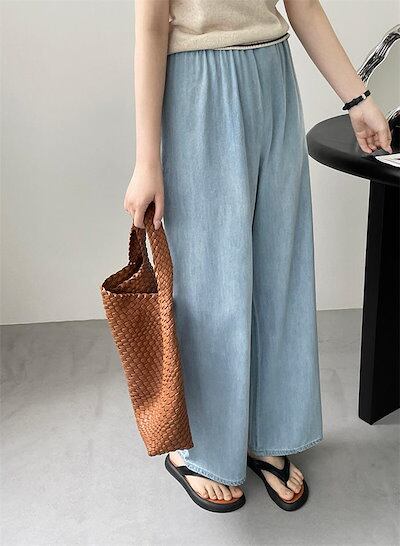 デニム ワイドパンツ 春夏 ロング レディース デニムワイドパンツ ロング 春 夏 秋 イージーパンツ デニムパンツ ボトムス 体型カバー ハイウエスト ギャザー ウエストゴム 大人 シンプル 無地