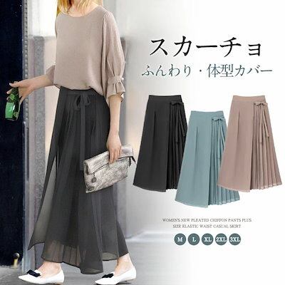 ガウチョパンツ シフォン 春夏 スカーチョ スカンツ ワイドパンツ ふんわり 薄め 無地 マキシ丈 パンツ レディース 大きいサイズ 体型カバー ゆったり ハイウエスト ゴムウエスト ロング丈 マキシ
