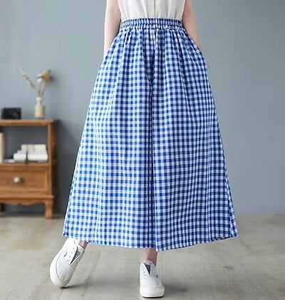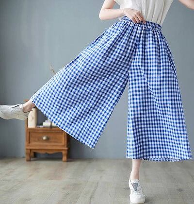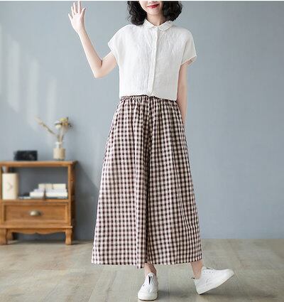 チェックパンツ レディース 綿 麻 パンツスカート 春 夏 9分丈 ウエストゴム パンツ ポケット付き ハイウエスト ゆったり オフィス ボトムス ワイド 無地 リネンパンツ カジュアル きれいめ ガ