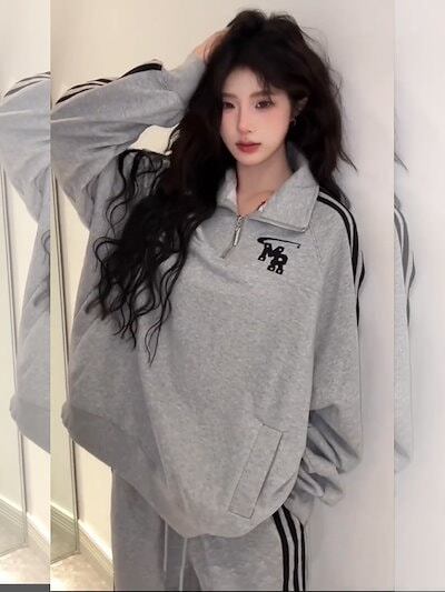 2024 秋冬 2点セット トップス 羽織り ショート丈 セットアップフルパーカートレーナーラウンドヘムルーズ サイド上下ボトムスストレート系冬ゆったりサイズワイドシルエットハーフリラックストラック
