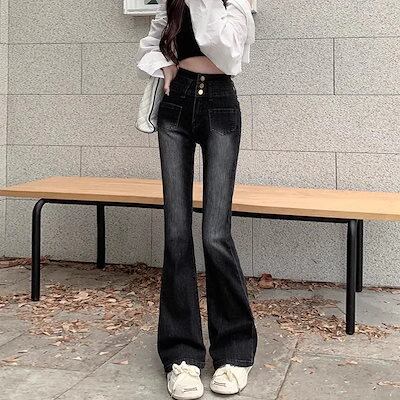 夏新作 梨地マイクロフレアジーンズ レディース 大きいサイズ ゆったり ハイウエスト スリム ストレッチ ワイドホースシューパンツ